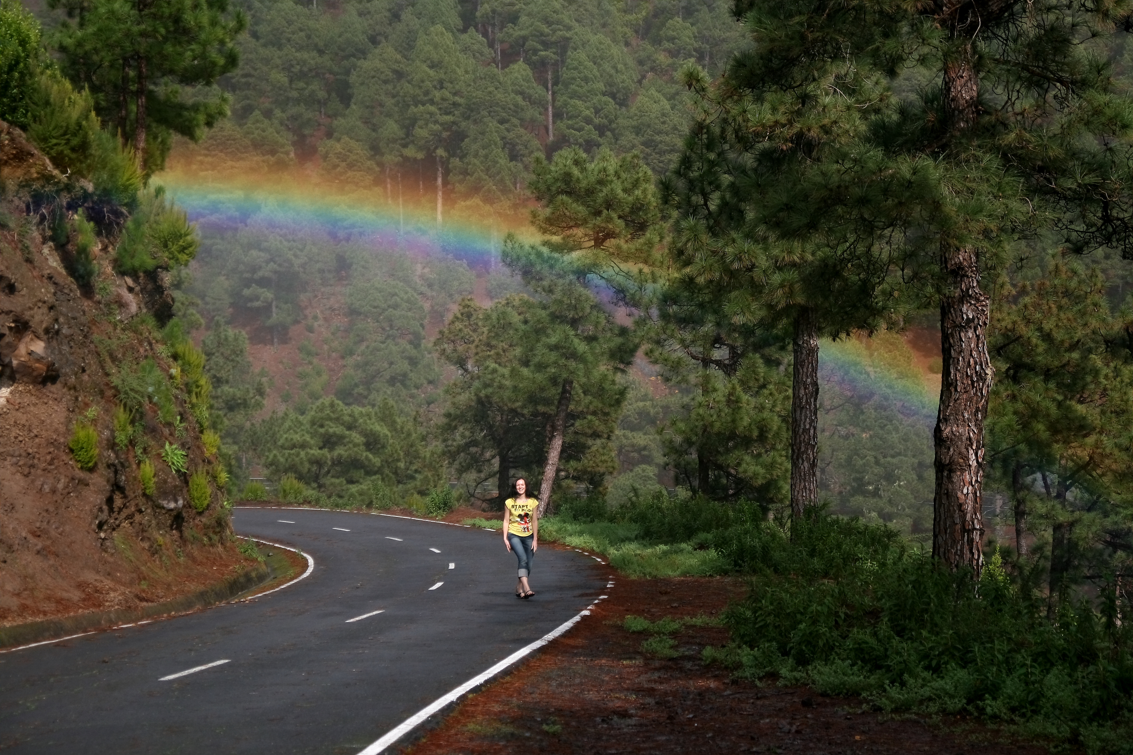 Kā jau zināms, lietum bieži klāt nāk bonuss – varavīksnes. La Palmā divas dienas pēc kārtas mēs novērojām kaut ko neticamu – gandrīz visu laiku kaut kur varēja redzēt kādu varavīksni, visādos izpildījumos un spilgtumos. Visvairāk man atmiņā palika varavīksne uz kāda mežaina kalnu ceļa (vispār “mežaini kalnu ceļi” un “La Palmas ceļi” ir praktiski sinonīmi). Aiz kāda līkuma mēs ieraudzījām fantastisku skatu – pāri ceļam bija pārliekusies neticami spilgta un zema varavīksne, to gandrīz varētu aizsniegt ar roku. Es, protams, visādos veidos izpildījos – lecu, lai mēģinātu aizsniegt varavīksni, un tā tālāk, un tā joprojām, un varavīksne tur stāvēja kā stāvējusi, un nekur nedomāja pazust.