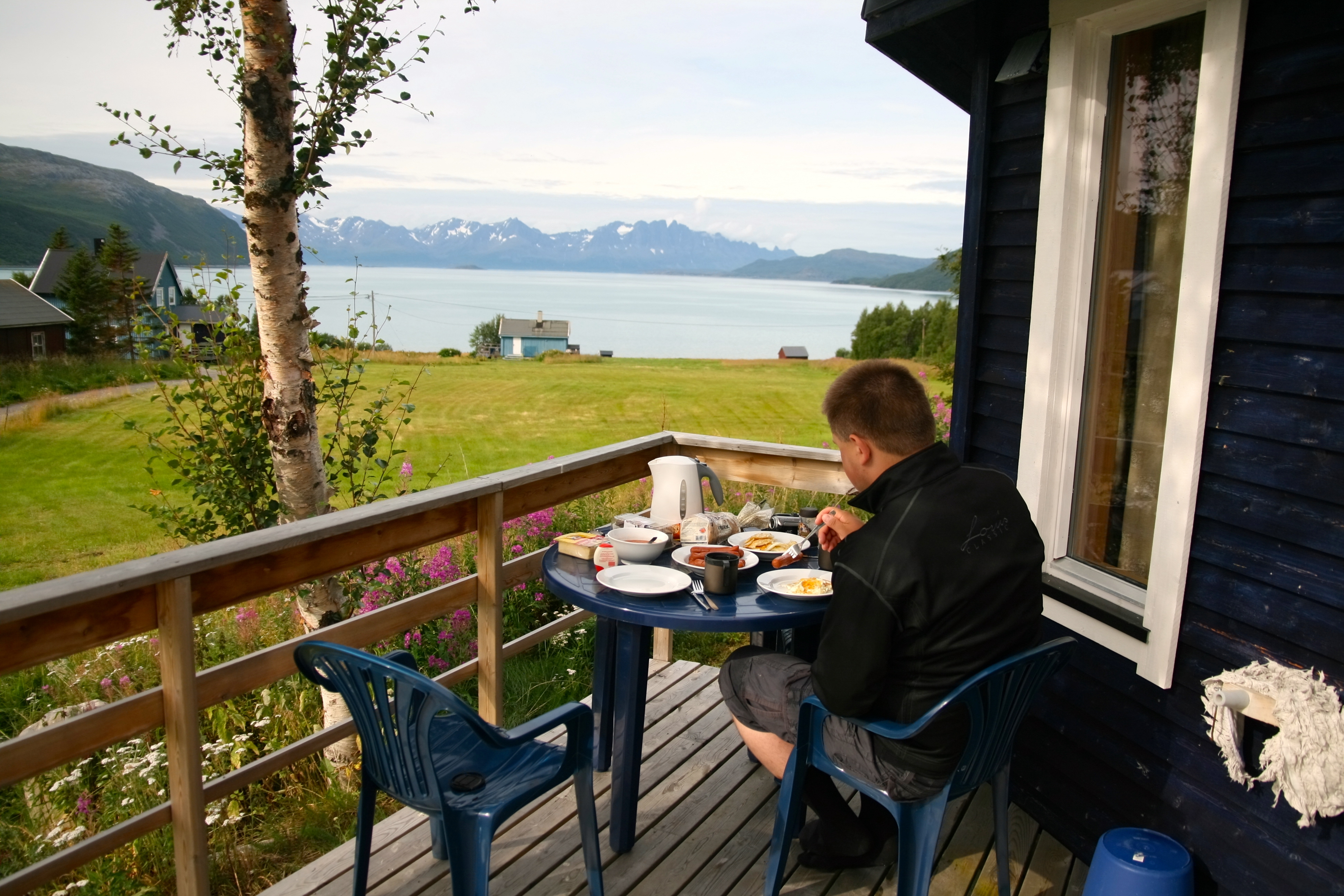 Runājot par skaistuma apvienošanu ar praktisko – visa ceļojuma laikā Norvēģijā pa nakti palikām mazajās mājiņās, kas tur ir ārkārtīgi populāras, un nav nemaz stipri dārgākas kā vienkārša telts vieta. Protams, mājiņu cenas atšķiras, ir pieejamas ar visām ekstrām, bet mēs parasti ņēmām pašas vienkāršākās – ar gultasvietu (bez gultasveļas) un plītiņu ēst gatavošanai, un bez savām labierīcībām. Mums galvenais bija pārlaist nakti siltumā, jo pamazām sāka veidoties ceļojuma maršruta aprises – sak, vai neaizšaut līdz Nordkapam. Tā kā iepriekš neko par to nebijām lasījuši, tad nebijām īsti pārliecināti par to, cik auksti tur ir, bet nolēmām būt prātīgi un nesaaukstēties jau ceļa sākumā. Lūk, tāpēc, arī turpmākajā ceļā izvēlējāmies mājiņas, nevis teltis – naktis bija drēgnas.