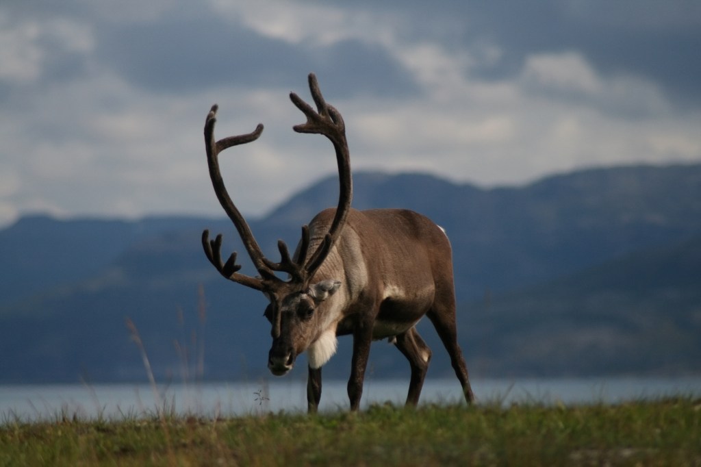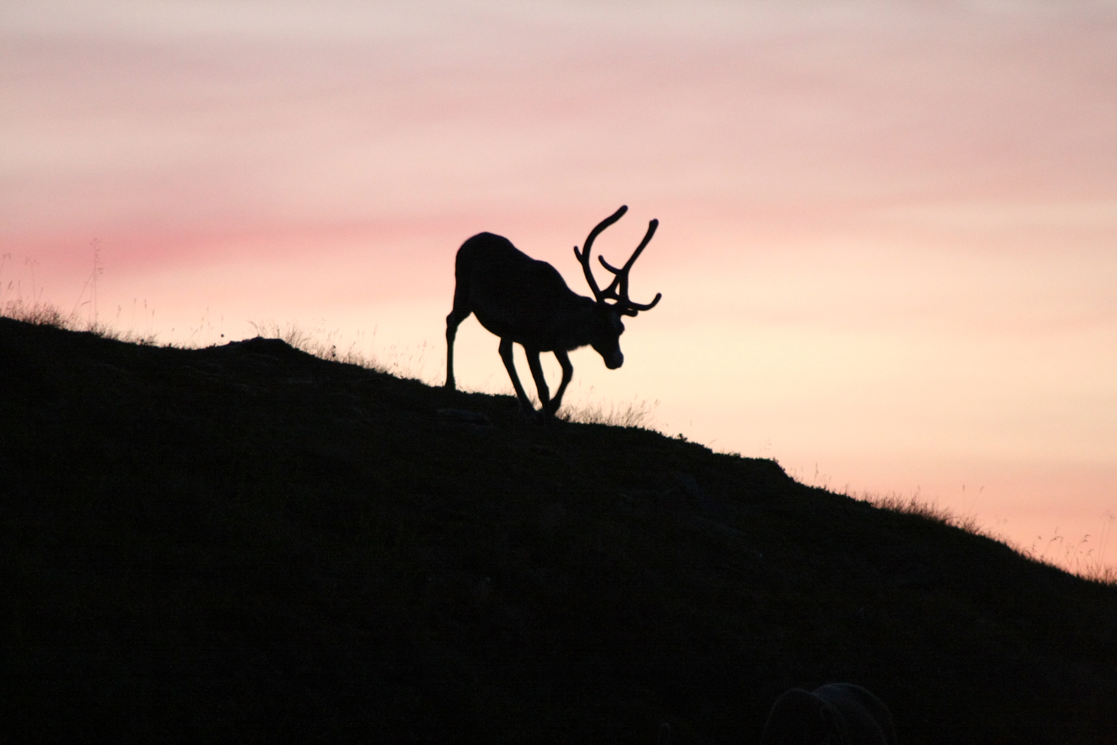 Pa nakti paliekam kempingā, mājiņā, kādus 10 km no Nordkapa. Gulēt ejam ap diviem, un joprojām ir gaišs (jūnijā un jūlijā saule pat nenoriet). No mājas lievenīša redzam, kā pret nebeidzamā saulrieta rozā krāsotajām debesīm kalna galā izzīmējas tumši ziemeļbriežu stāvi………